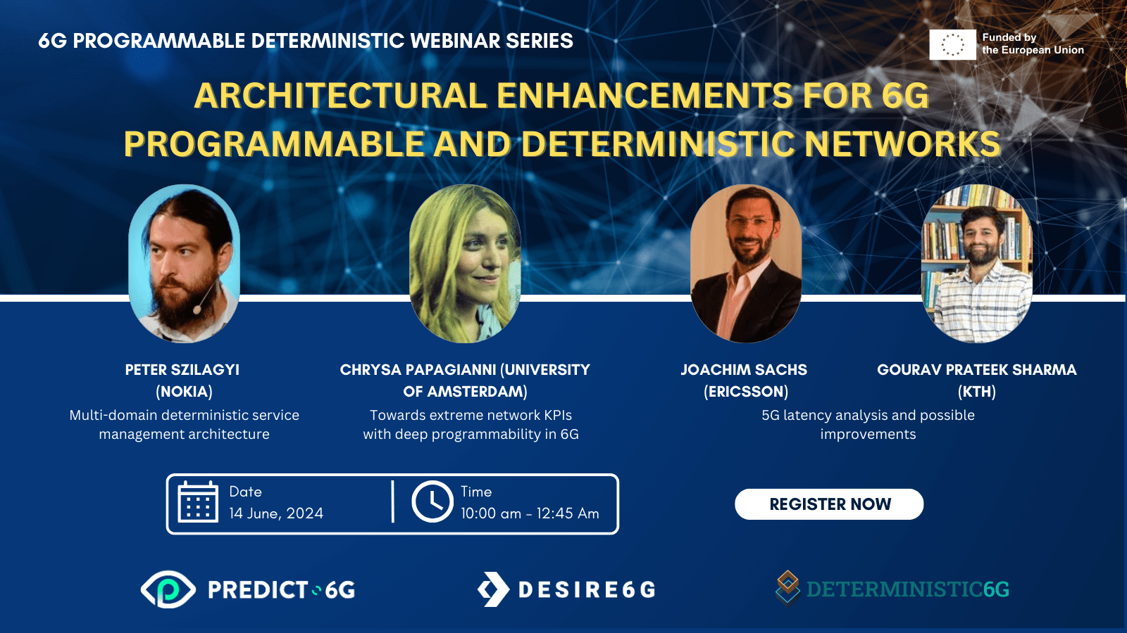 The “6G Programmable Deterministic Webinar Series” was launched on the 14 of June 2024, a collaborative initiative between PREDICT-6G, DESIRE6G, and DETERMINISTIC6G. This quarterly series aims to explore the intricate and transformative aspects of these sister projects, featuring expert speakers who will discuss the latest developments and innovations shaping the future of 6G technology. Each session provides in-depth information and fosters key discussions for practitioners and researchers dedicated to the next generation of wireless communications.