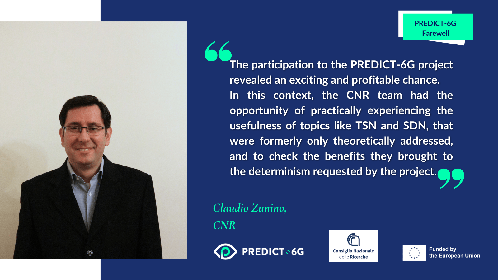 Claudio Zunino on behalf of the Consiglio Nazionale delle Ricerche (CNR). CNR contributed to the development of the core components of the PREDICT-6G network and validated its architecture in a critical use case at the Budapest Open Lab. “The participation in the PREDICT-6G project revealed an exciting and profitable chance. In this context, the CNR team had the opportunity of practically experiencing the usefulness of topics like TSN and SDN, that were formerly only theoretically addressed, and to check the benefits they brought to the determinism requested by the project”.