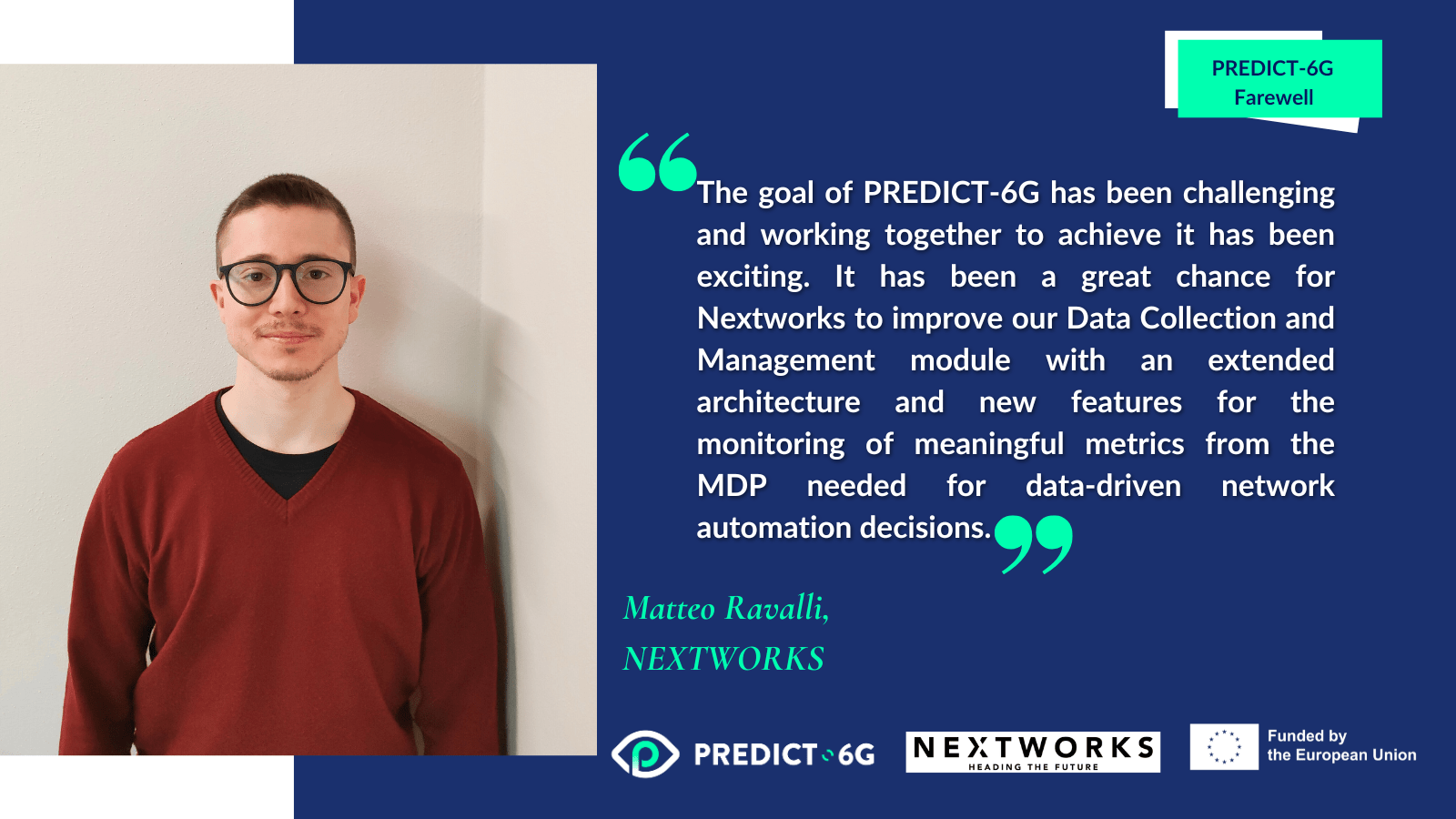 Matteo Ravalli on behalf of Nextworks, PREDICT-6G Monitoring Platform and Data Management for deterministic networks task leader. “The goal of PREDICT-6G has been challenging and working together to achieve it has been exciting. It has been a great chance for Nextworks to improve our Data Collection and Management module with an extended architecture and new features for the monitoring of meaningful metrics from the MDP needed for data-driven network automation decisions”.