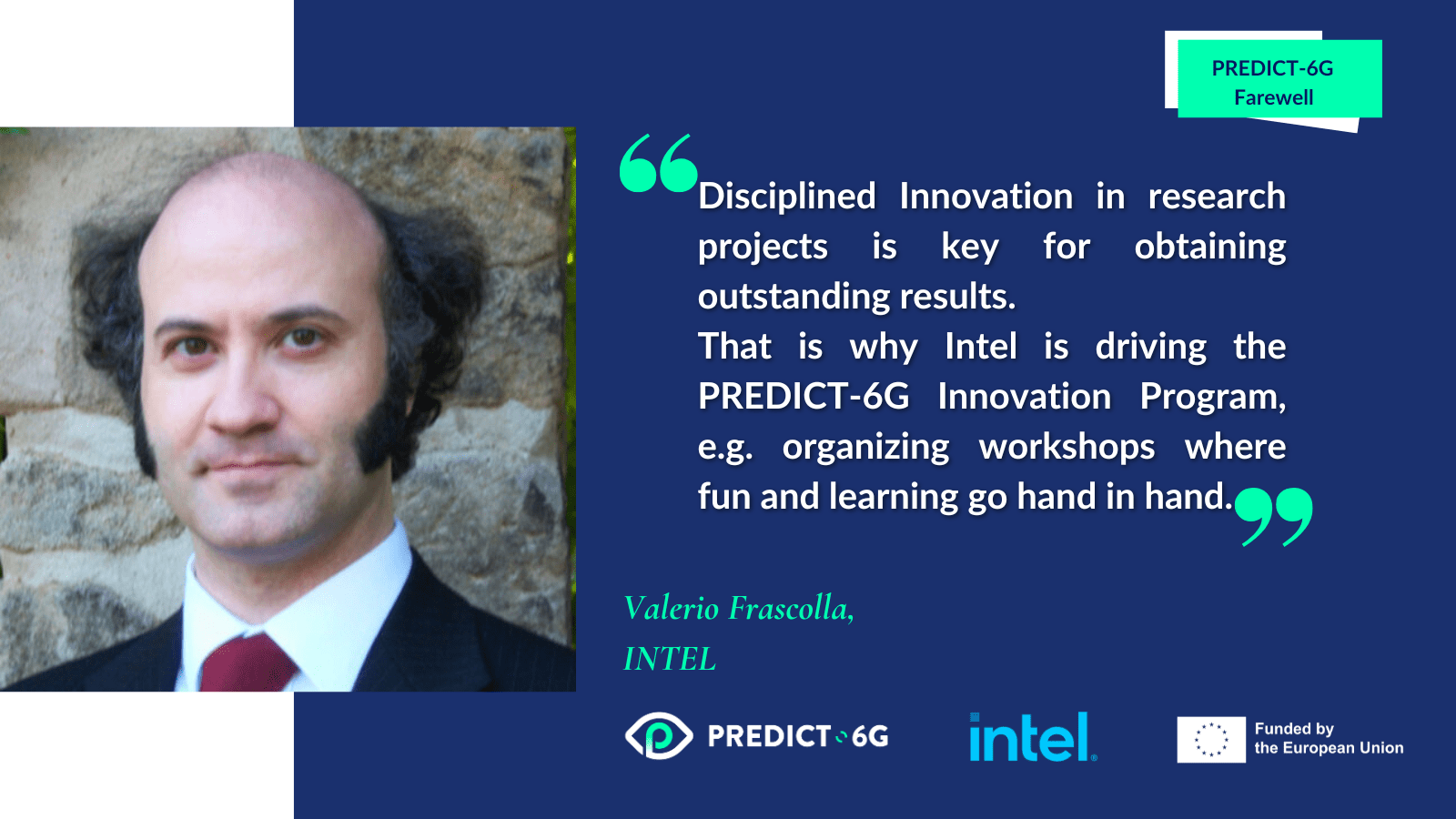 Valerio Frascolla on behalf of Intel, leader of the PREDICT-6G Impact Creation Work Package. “Disciplined Innovation in research projects is key for obtaining outstanding results. That is why Intel is driving the PREDICT-6G Innovation Program, e.g. organizing workshops where fun and learning go hand in hand”.