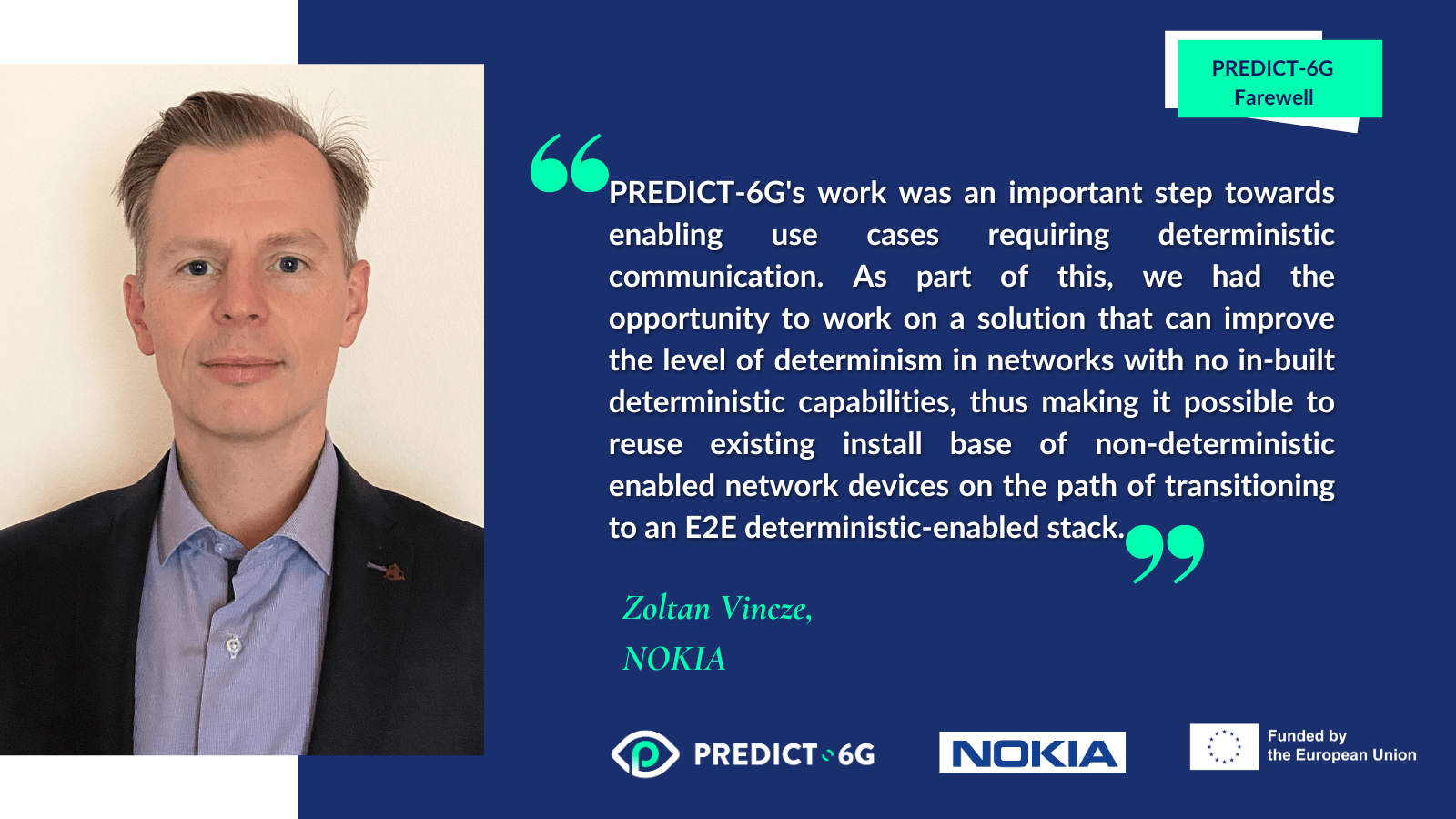 Zoltán Vincze on behalf of Nokia, leader of the PREDICT-6G task called ‘definition of the system architecture’. “PREDICT-6G’s work was an important step towards enabling use cases requiring deterministic communication. As part of this, we had the opportunity to work on a solution that can improve the level of determinism in networks with no in-built deterministic capabilities, thus making it possible to reuse existing install base of non-deterministic enabled network devices on the path of transitioning to an E2E deterministic-enabled stack”.