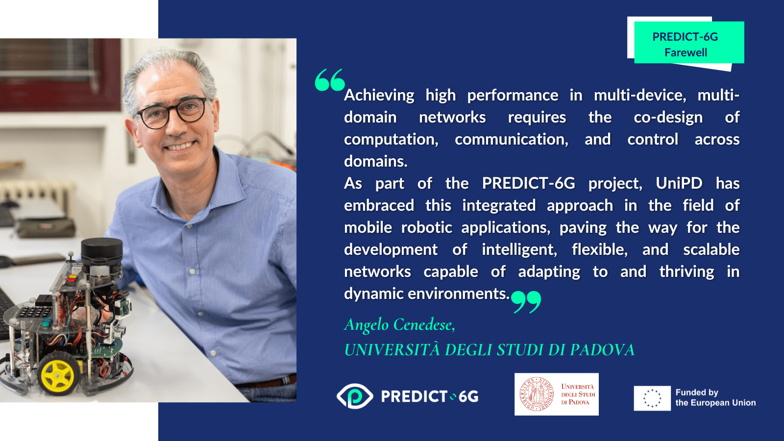 Angelo Cenedese on behalf of Università degli Studi di Padova, a PREDICT-6G partner contributing to the development of the AI-driven multi-stakeholder inter-domain control plane, and to the integration and verification of use cases. “Achieving high performance in multi-device, multi-domain networks requires the co-design of computation, communication, and control across domains. As part of the PREDICT-6G project, UniPD has embraced this integrated approach in the field of mobile robotic applications, paving the way for the development of intelligent, flexible, and scalable networks capable of adapting to and thriving in dynamic environments”.