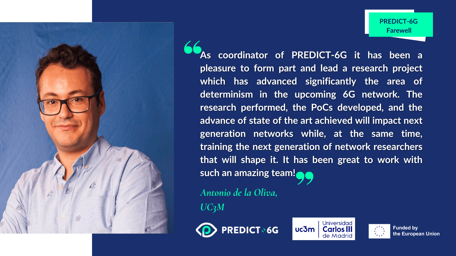 Antonio De La Oliva on behalf of Universidad Carlos III de Madrid, PREDICT-6G Coordinator. “As coordinator of PREDICT-6G it has been a pleasure to form part and lead a research project which has advanced significantly the area of determinism in the upcoming 6G network. The research performed, the PoCs developed, and the advance of state of the art achieved will impact next generation networks while, at the same time, training the next generation of network researchers that will shape it. It has been great to work with such an amazing team!”