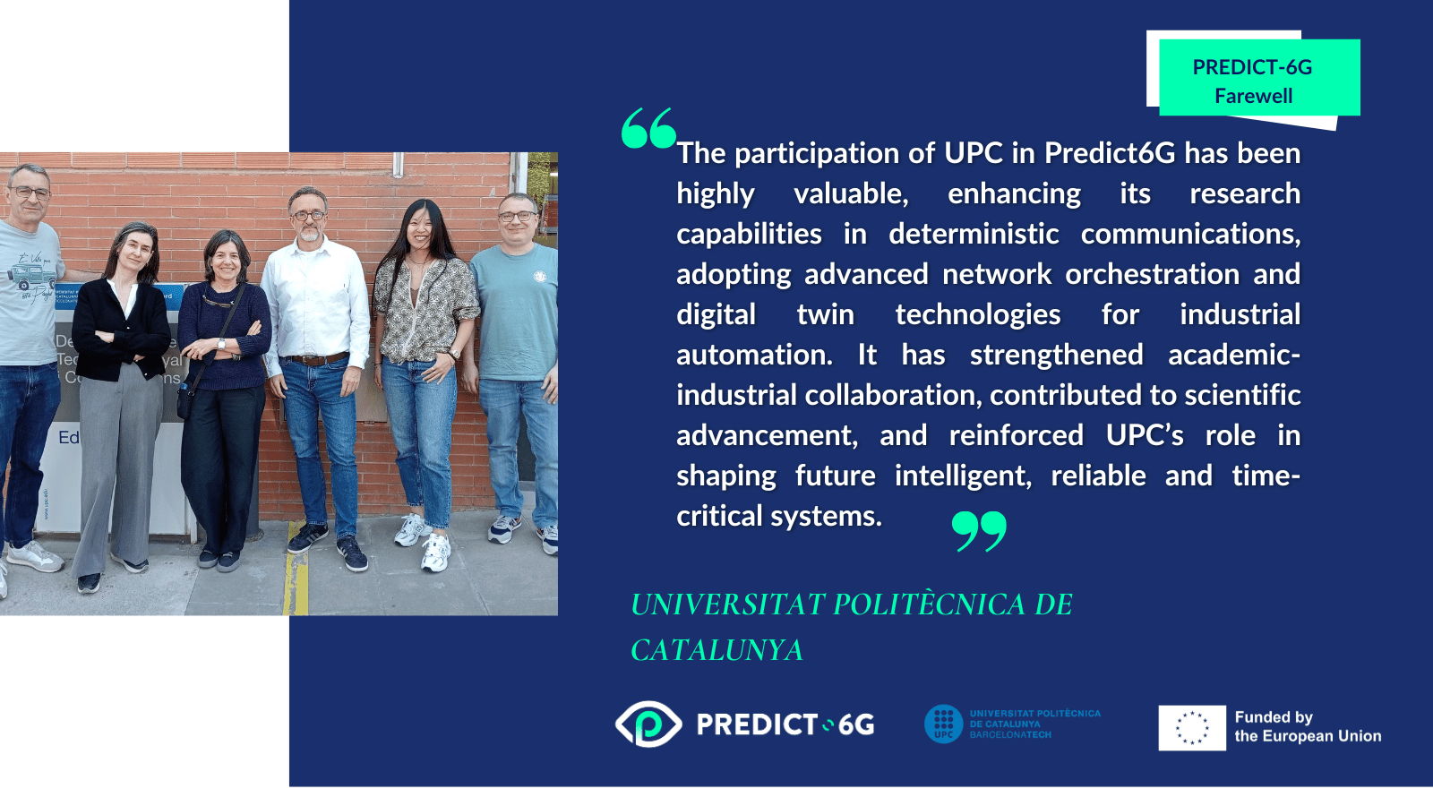 The team from Universitat Politècnica de Catalunya, leader of the PREDICT-6G task called ‘Predictability through Digital Twinning Solutions’. “The participation of UPC in Predict6G has been highly valuable, enhancing its research capabilities in deterministic communications, adopting advanced network orchestration and digital twin technologies for industrial automation. It has strengthened academic-industrial collaboration, contributed to scientific advancement, and reinforced UPC’s role in shaping future intelligent, reliable and time-critical systems”.