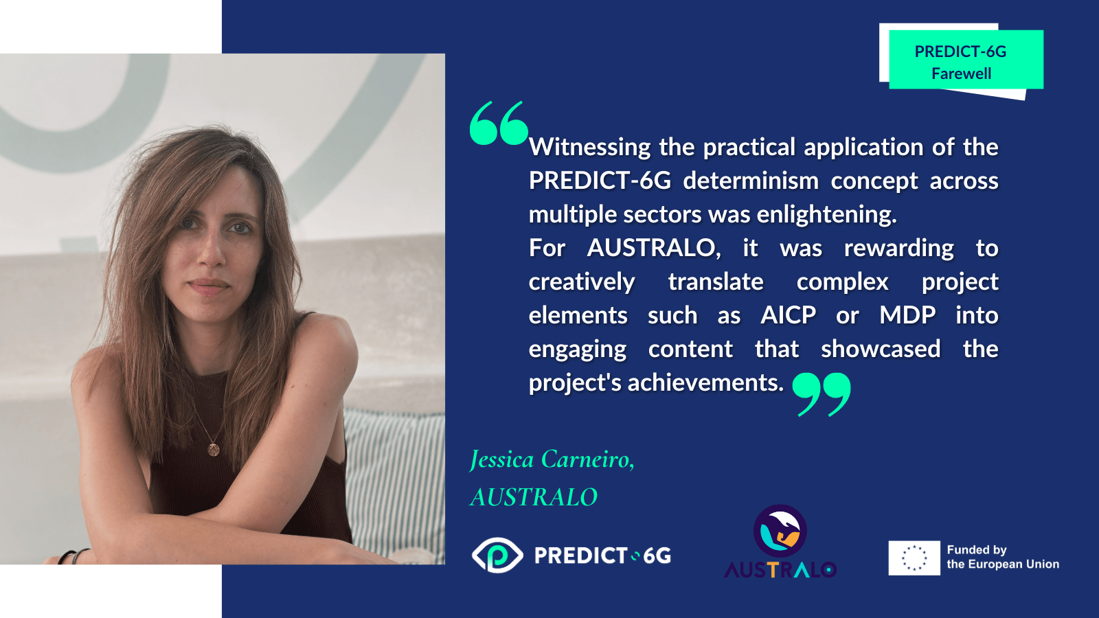 Jessica Carneiro on behalf of AUSTRALO, PREDICT-6G Dissemination and Communication Task Leader.“Witnessing the practical application of the PREDICT-6G determinism concept across multiple sectors was enlightening.For AUSTRALO, it was rewarding to creatively translate complex project elements such as AICP or MDP into engaging content that showcased the project’s achievements”.