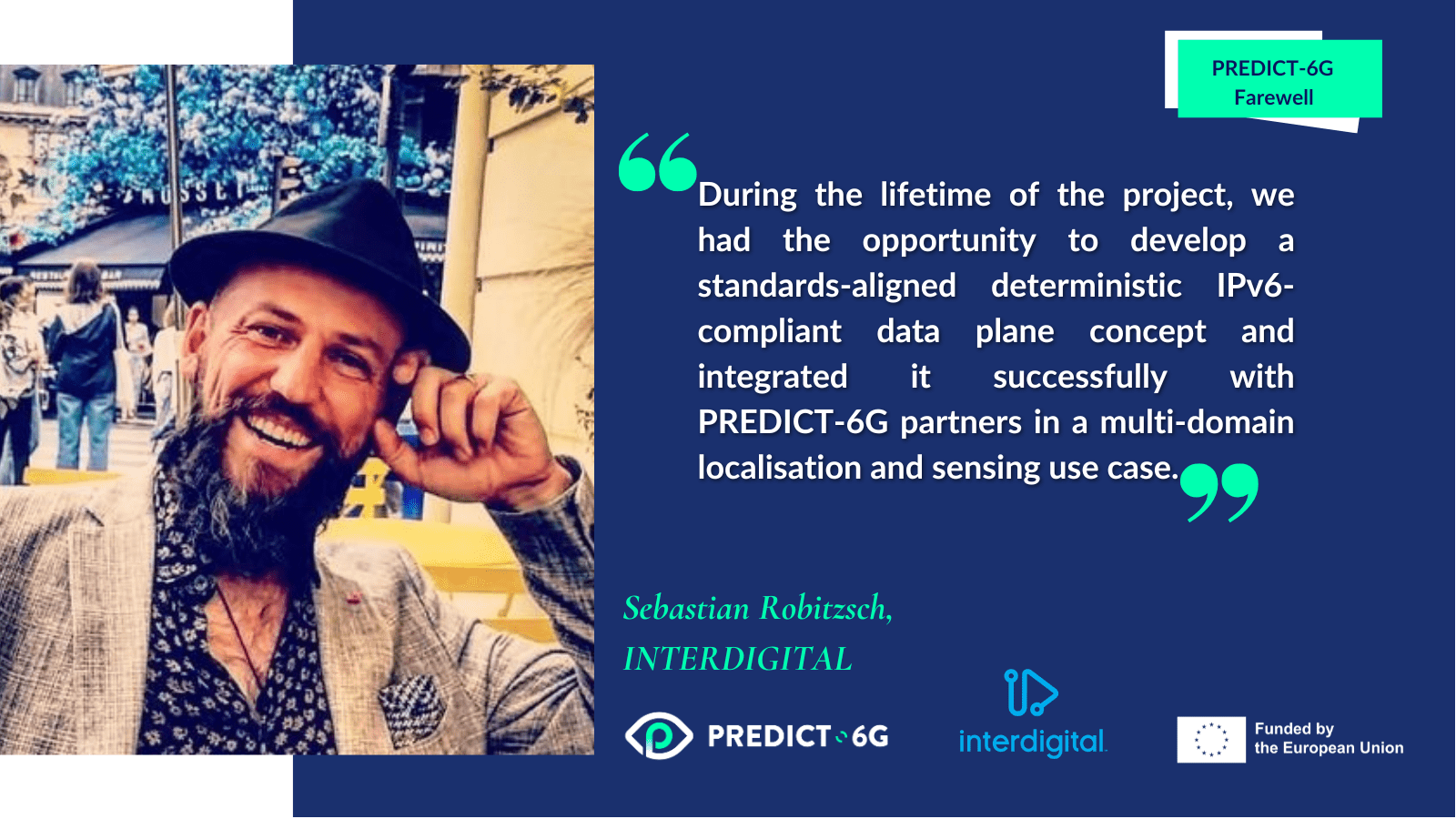 Sebastian Robitzsch on behalf of InterDigital, and responsible for the standardisation of PREDICT-6G. “During the lifetime of the project, we had the opportunity to develop a standards-aligned deterministic IPv6-compliant data plane concept and integrated it successfully with PREDICT-6G partners in a multi-domain localisation and sensing use case”.