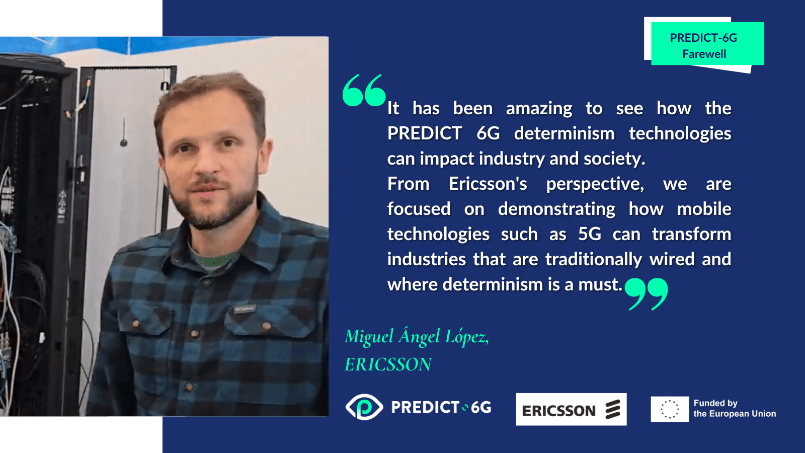 Miguel Ángel López on behalf of Ericsson, leader of the PREDICT-6G Multi-technology multi-domain Data-Plane Work Package. “It has been amazing to see how the PREDICT-6G determinism technologies can impact industry and society. From Ericsson’s perspective, we are focused on demonstrating how mobile technologies such as 5G can transform industries that are traditionally wired and where determinism is a must”.