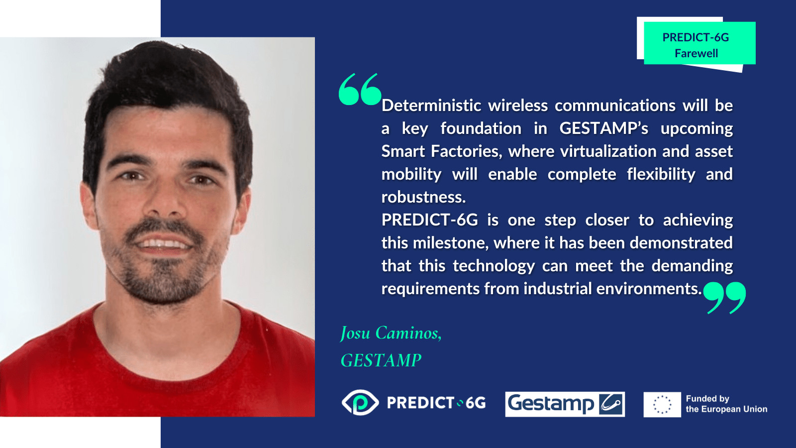 Josu Caminos on behalf of Gestamp, part of the PREDICT-6G Smart Factory use case. “Deterministic wireless communications will be a key foundation in GESTAMP’s upcoming Smart Factories, where virtualization and asset mobility will enable complete flexibility and robustness. PREDICT-6G is one step closer to achieving this milestone, where it has been demonstrated that this technology can meet the demanding requirements from industrial environments”.