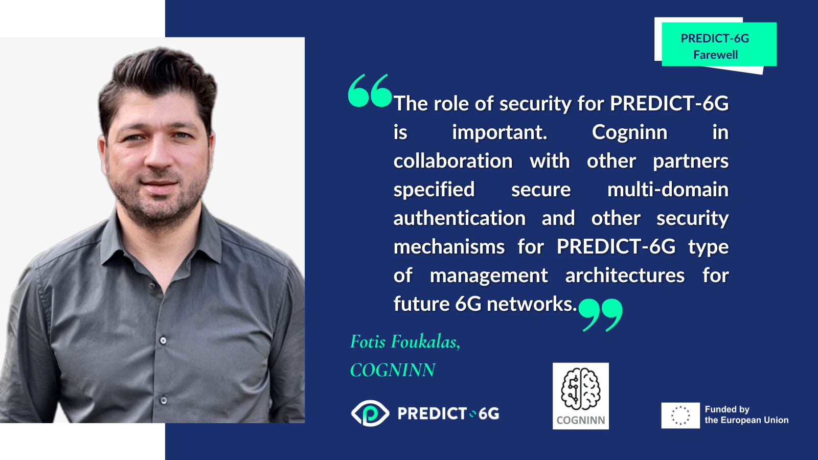 Fotis Foukalas on behalf of Cogninn, the partner responsible for overseeing the security aspects of the PREDICT-6G network. “The role of security for PREDICT-6G is important. Cogninn in collaboration with other partners specified secure multi-domain authentication and other security mechanisms for PREDICT-6G type of management architectures for future 6G networks“.