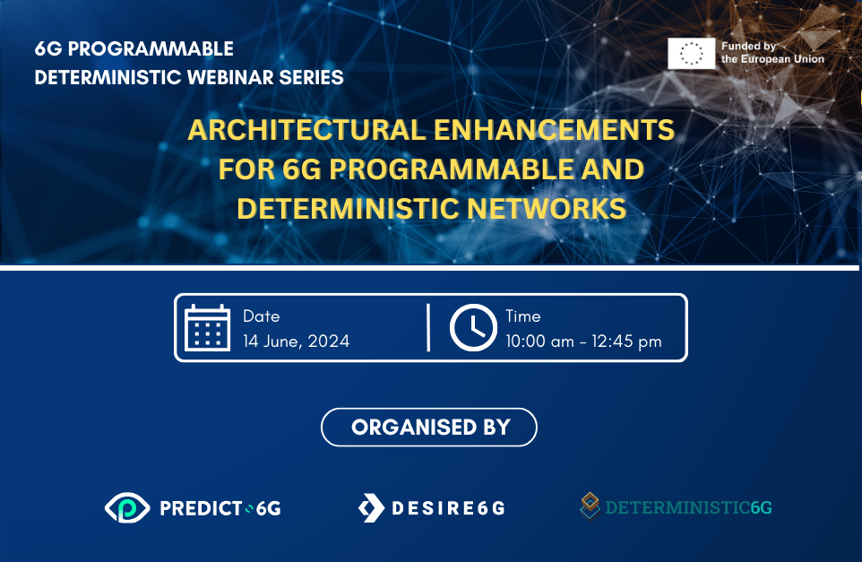 The “6G Programmable Deterministic Webinar Series'' is a collaborative initiative between PREDICT-6G, DESIRE6G, and DETERMINISTIC6G launched on the 14 of June 2024. This quarterly series aims to explore the intricate and transformative aspects of these sister projects, featuring expert speakers who will discuss the latest developments and innovations shaping the future of 6G technology. Each session provides in-depth information and fosters key discussions for practitioners and researchers dedicated to the next generation of wireless communications.