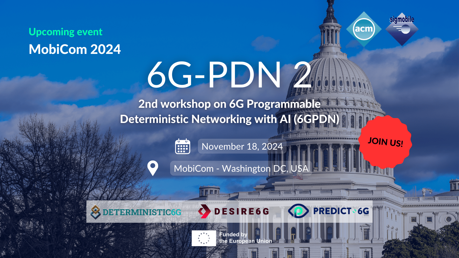 The Annual International Conference on Mobile Computing and Networking (MobiCom 2024) will be held on the 18-22 of November in Washington DC, USA. In this scope, DESIRE6G, DETERMINISTIC6G and PREDICT-6G will co-organise the 2nd workshop on "6G Programmable Deterministic Networking with AI" (6G-PDN 2), which will take place on the 18th November.