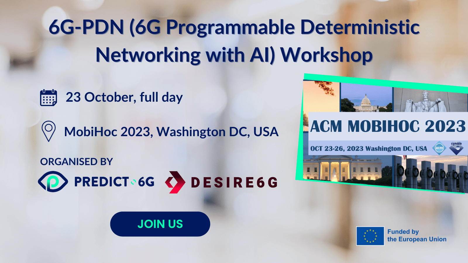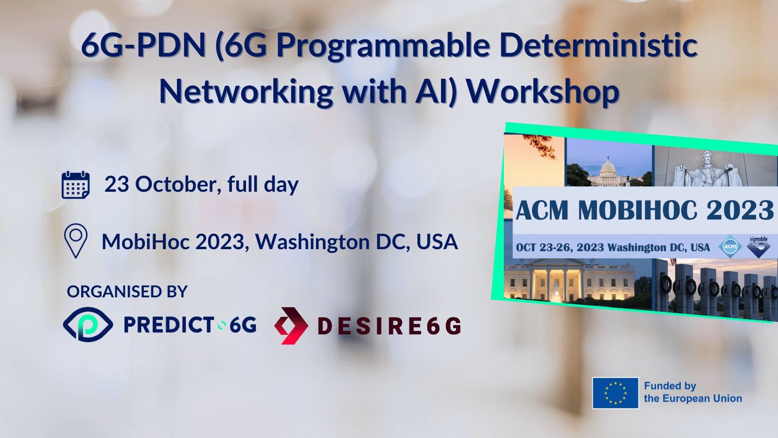 We are pleased to announce that PREDICT-6G and DESIRE6G successfully co-organised the "6G Programmable Deterministic Networking with AI" workshop (6G-PDN)” on the 23 of October 2023, at the prestigious 24th International Symposium on Theory, Algorithmic Foundations, and Protocol Design for Mobile Networks and Mobile Computing (MobiHoc 2023) held in Washington DC, United States.